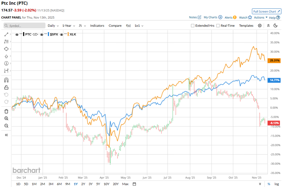 Despite reporting better-than-expected Q4 2025 adjusted EPS of $3.47 and revenue of $893.8 million on Nov. 5, shares of PTC tumbled 8.4% the next day. The company issued weaker-than-expected fiscal 2026 guidance, with GAAP EPS projected to drop to $4.37 - $6.87. Investors were also concerned that 2026 revenue guidance of $2.65 billion - $2.92 billion signaled slower growth compared with 2025’s $2.74 billion, implying potential top-line pressure following the divestiture of Kepware and ThingWorx.
