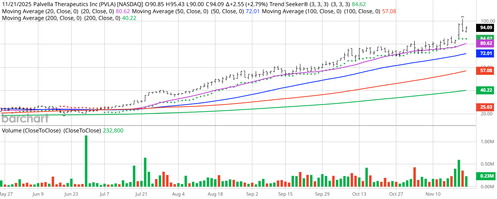 I found today’s Chart of the Day by using Barchart’s powerful screening functions to sort for stocks with the highest technical buy signals; superior current momentum in both strength and direction; and a Trend Seeker “buy” signal. I then used Barchart’s Flipcharts feature to review the charts for consistent price appreciation. PVLA checks those boxes. Since the Trend Seeker signaled a new “Buy” on July 9, the stock has gained 295.85%.