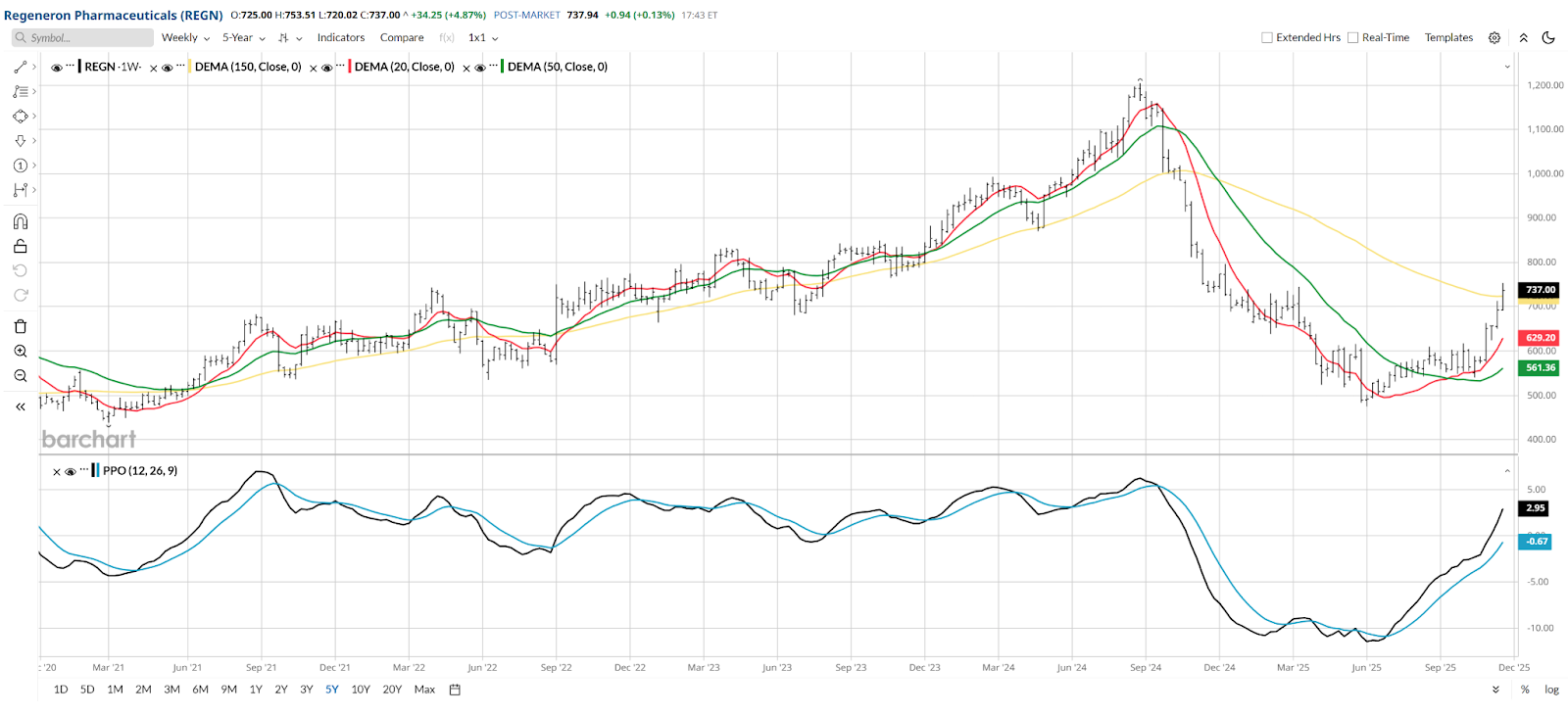 Regeneron (REGN) is one of the largest biotech companies in the world, and made its reputation by targeting serious and often overlooked medical conditions. The stock is not overlooked anymore, up nearly 28% in a month. But it is still below its price level from three years ago.