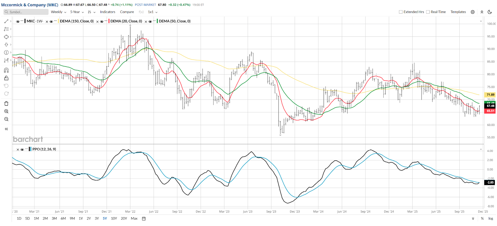 MKC is a slow-going stock most of the time. But it is attempting to create a rounded bottom here, and has rallied from this level before. It is not there yet, as its 20-week moving average is still moving lower. But if the market continues to flock to defensive names, this stock can be in the sweet spot once again.