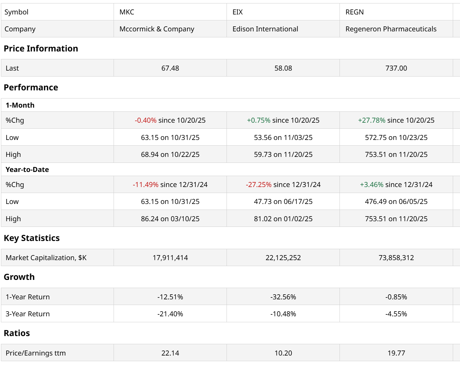 McCormick (MKC) is known for living on your kitchen table and in your pantry. It is the leading maker of spices, and even at 22x trailing earnings, the stock looks spicier than most. It has lost money for shareholders the past three years, but these are the types of markets where stability sells. MKC has that going for it.