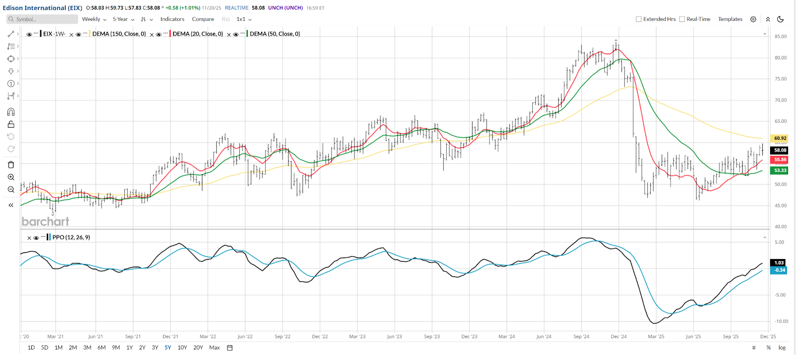EIX appears to be on the move higher. There’s plenty of risk here, as the firm is not yet off the hook for past issues affecting its area. But for true contrarians, it may have appeal.