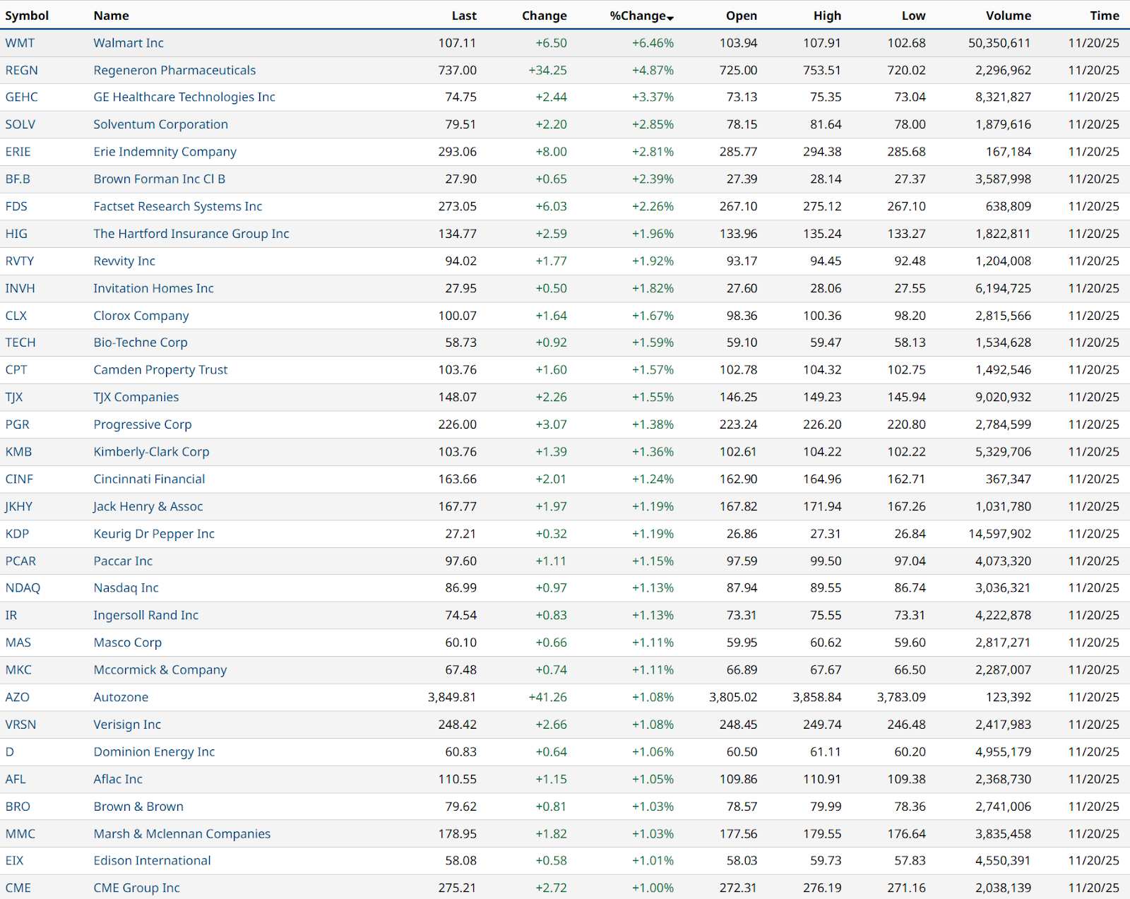 In all, about one-fourth of the S&P 500 Index stocks were positive, but 32 of them were up at least 1%. That’s always something that hits my radar. Here they are.