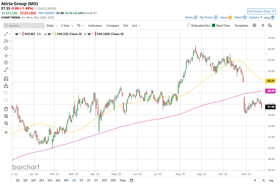 However, MO stock has absorbed notable turbulence. Its shares have fallen more than 16.4% from the 52-week high of $68.80 reached on Aug. 22. Moreover, the stock slipped 15.3% over the past three months, while the S&P 500 Index ($SPX) gained 3.7% during the same period, signaling a weakening narrative around the company’s near-term momentum.
