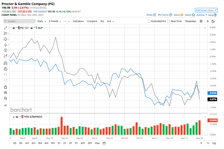 But even though P&G holds a dominant position in household essentials, its stock performance has been rocky lately. In the past three months, P&G shares have slid about 7.4% and remain roughly 18.5% below its November 2024 high of $180.43. And it’s not just P&G, the broader consumer-staples sector is wrestling with headwinds too. The Consumer Staples Select Sector SPDR Fund (XLP) is down 6.6% over the same period, though still managing to outperform P&G’s deeper slide.