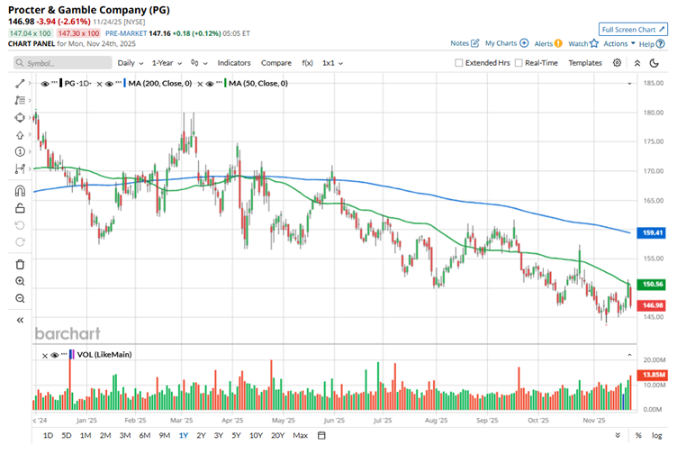 From a technical standpoint, the trend hasn’t been in P&G’s favor either. The stock has stayed below its 200-day moving average since late May, signaling persistent long-term weakness. Even short-term momentum hasn’t provided relief, with shares failing to hold above the 50-day moving average during the same period despite a few temporary upticks along the way.