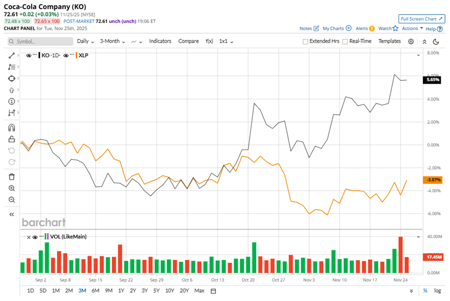 Despite its notable strength, KO slipped 2.4% from its 52-week high of $74.38, achieved on Apr. 22. Over the past three months, KO stock gained 5.3%, outperforming the Consumer Staples Select Sector SPDR Fund’s (XLP) 3.7% decline during the same time frame.