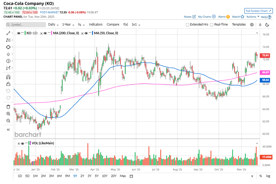 To confirm the bullish trend, KO has been trading above its 50-day and 200-day moving averages since mid-October, with some fluctuations.