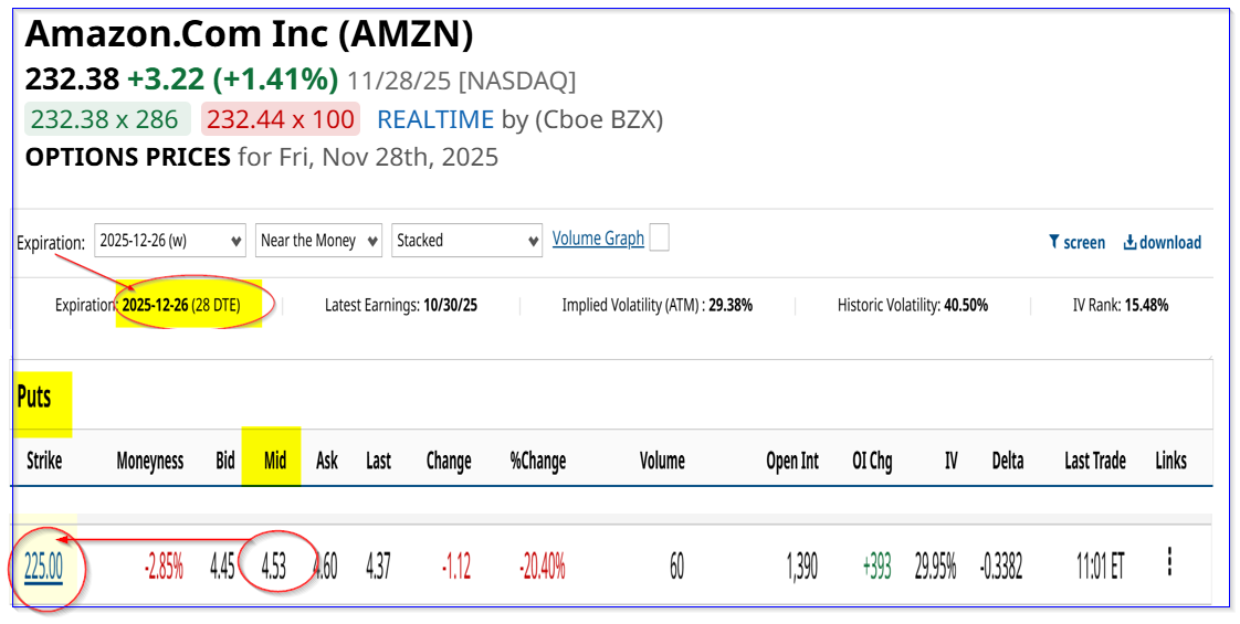 For example, the Dec. 26, 2025, put option period shows that the $225.00 strike price put option has a midpoint premium of $4.53. That provides an immediate cash-secured put option yield of 2.0% (i.e., $4.53/225.00).