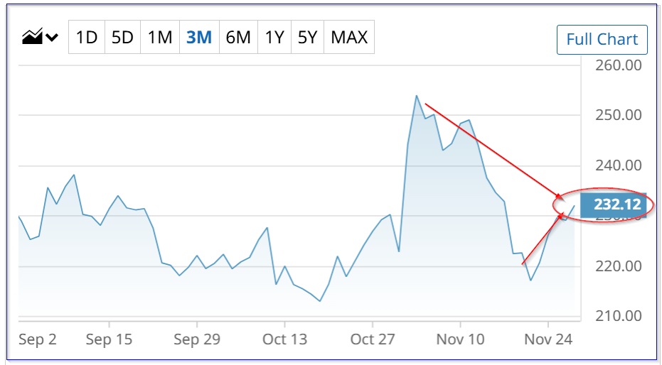 AMZN is trading at $232.03 in late trading today, as the market closes early. This is up from a recent low of $217.14 on Nov. 20.