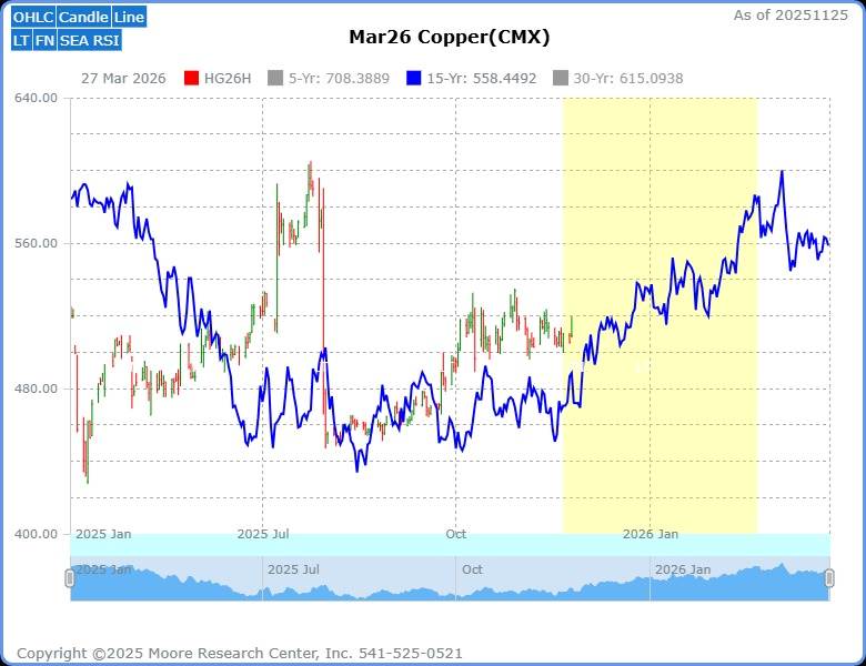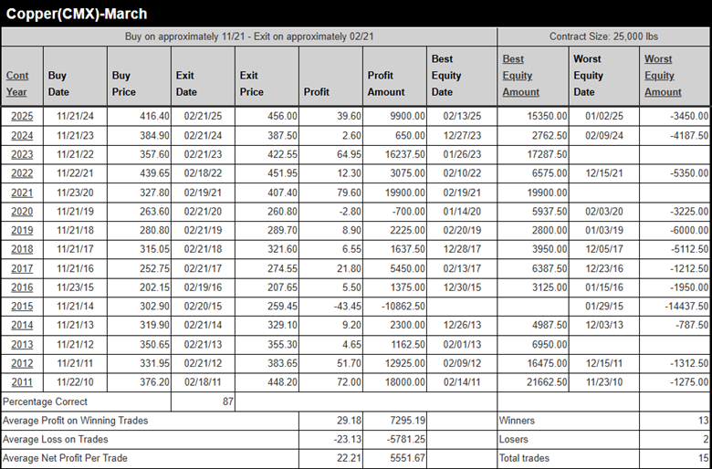Through extensive research, MRCI has identified a 15-year seasonal pattern (blue) showing a seasonal low around mid-August. Through further research, they have identified an optimal seasonal window (yellow area) before the copper market makes a significant upmove. Historically, March copper prices have closed higher on February 21 than on November 21 for 13 of the past 15 years, an 87% occurrence rate. Allowing traders to trade a core position or possibly trade in a bullish bias during the seasonal window. During the hypothetical testing, the average net profit per trade was 22.21 handles (points) or $5,551.67 per standard contract.