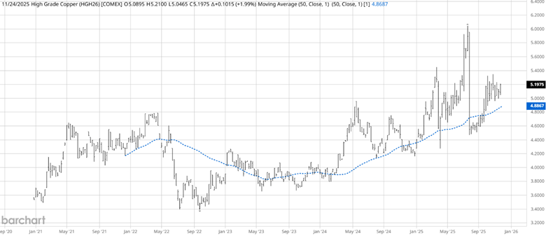 The weekly chart of the March 2026 copper futures contract shows the market has been in an uptrend since hitting a contract low of $3.3940 on September 26, 2022. As the trend has matured, March copper prices have set multiple new contract highs, including the recent high of $6.0460 on July 21, 2025. The 50-week moving average has served as support for this uptrend during price corrections.