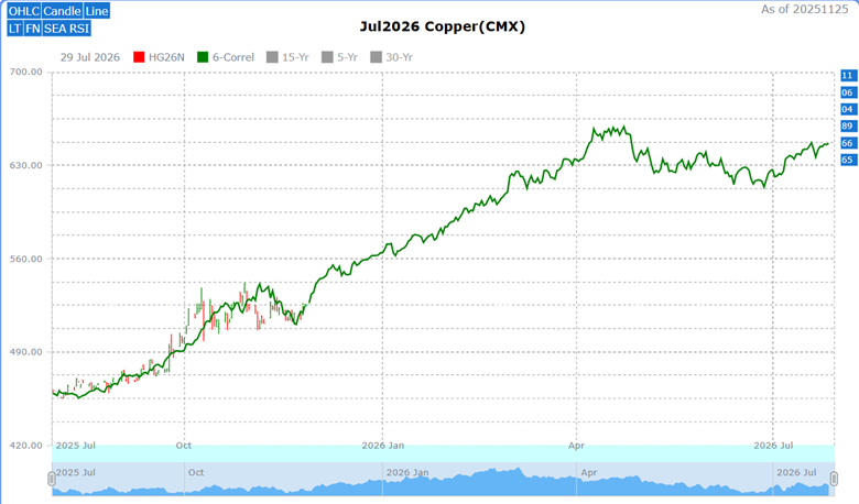 Copper futures contract months are closely correlated and can change by different increments from day to day, but they generally move in lockstep in the same direction. The July copper futures contract has an interesting 6-year market correlation (green): 2011: 91%; 2006: 88%; 2004: 87%; 1989: 89%; 1966: 90%; 1965: 87%: all six correlate 87% or higher.