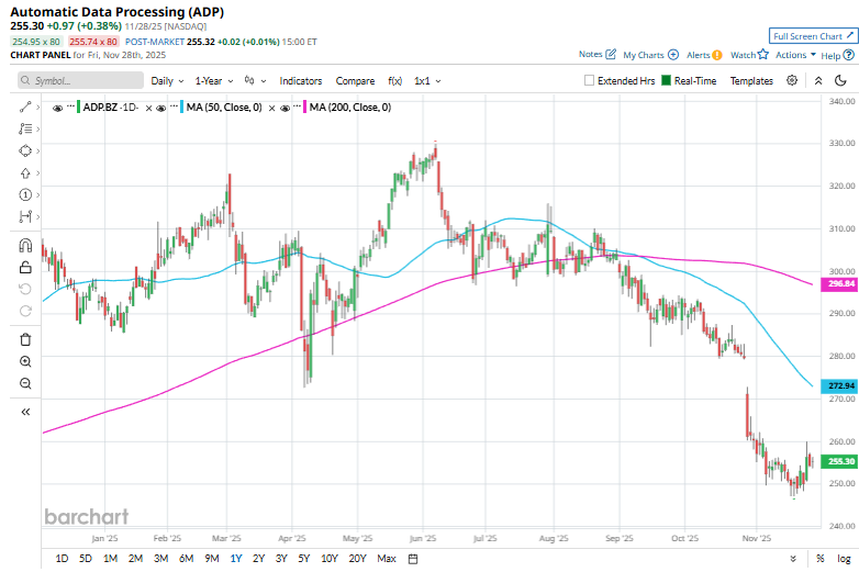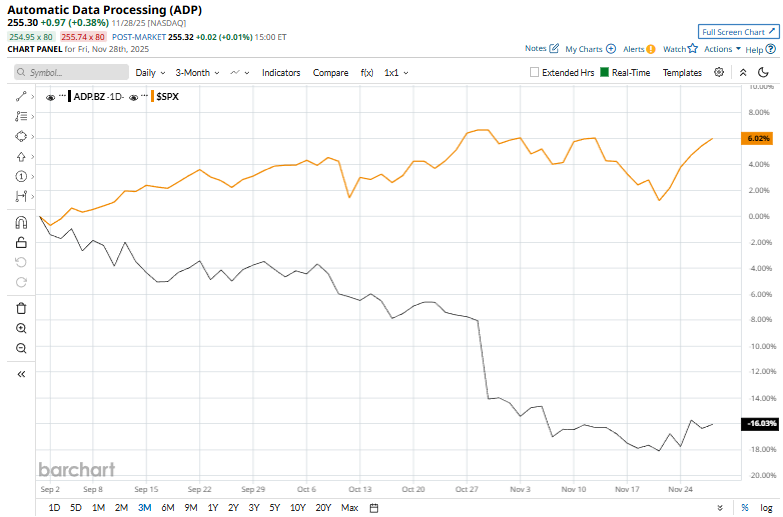 Despite its notable strength, ADP has fallen 22.6% from its 52-week high of $329.93. Over the past three months, ADP stock declined 16.1%, trailing the S&P 500 Index ($SPX) 5.3% surge during the same time frame.