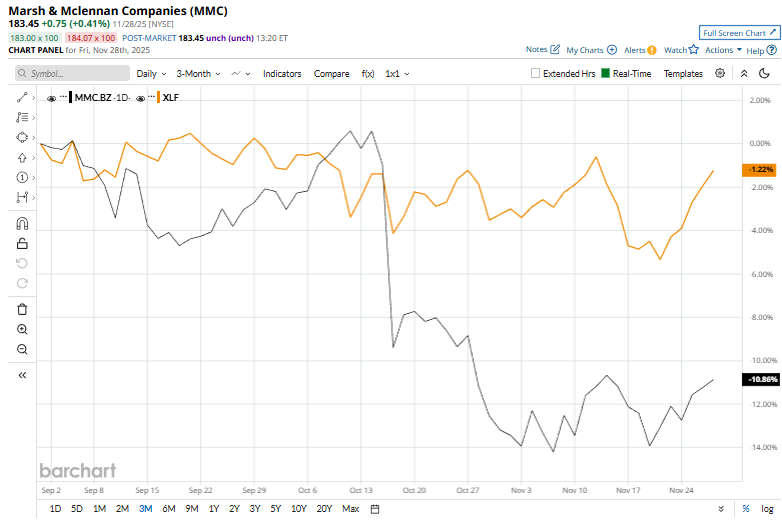 MMC stock has dropped 13.6% on a YTD basis and 21.4% over the past 52 weeks, lagging behind the XLF’s 10.4% gains in 2025 and 4% surge over the past year.
