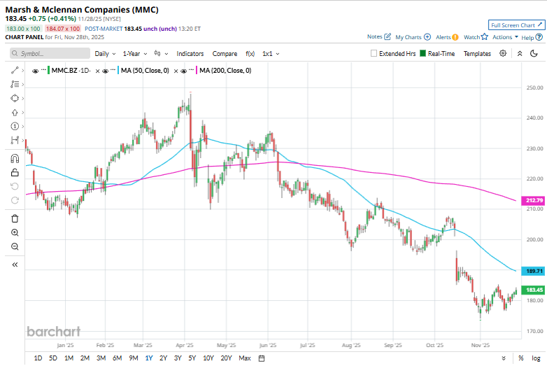 Indicating a bearish trend, MMC stock has remained mostly below its 50-day moving average since early April, with some fluctuations, and under its 200-day moving average since early June.