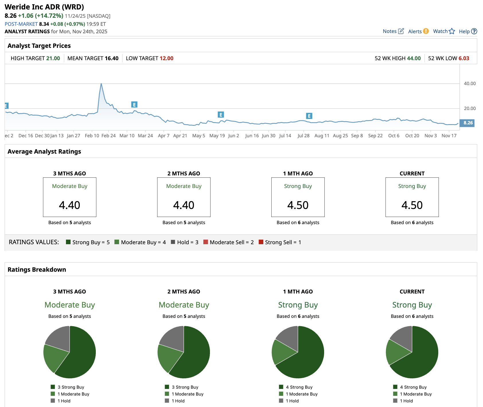 Out of the six analysts covering WeRide stock, four recommend “Strong Buy,” one recommends “Moderate Buy,” and one recommends “Hold.”