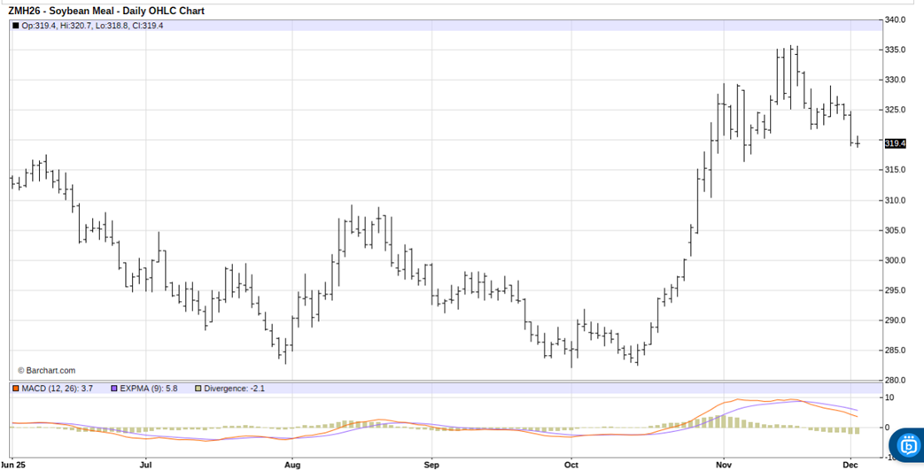 March soybean meal (ZMH26) futures present a selling opportunity on more price weakness.