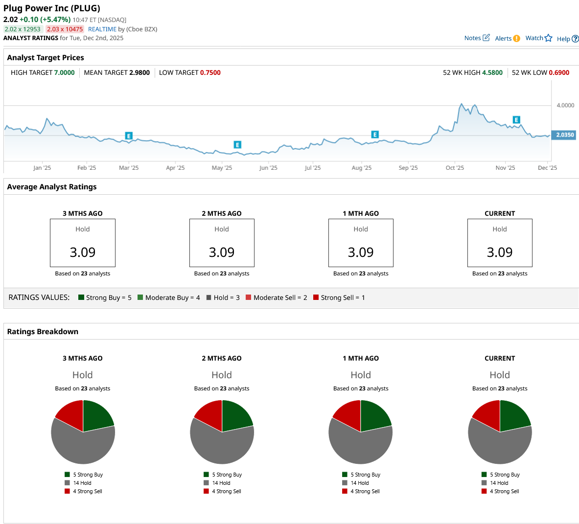 Wall Street projects Plug Power to end 2029 with a free cash outflow of $257 million. If the stock is priced at 20x forward FCF, it could double over the next three years. Out of the 23 analysts covering Plug Power stock, five recommend “Strong Buy,” 14 recommend “Hold,” and four recommend “Strong Sell.” The average PLUG stock price target is $2.98, indicating an upside potential of about 50% from current levels.