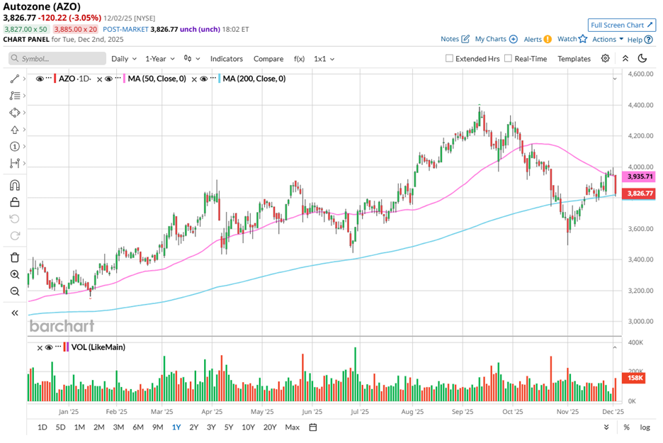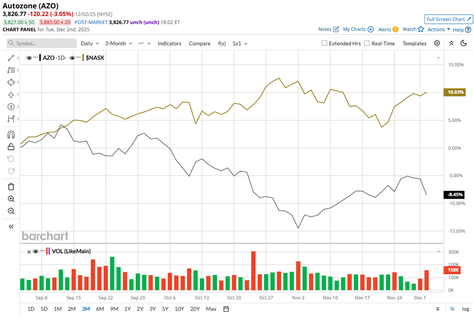AZO shares currently trade 12.8% below their September high of $4,388.11, reflecting a period of near-term pressure. In fact, the stock has declined 8.5% over the past three months, noticeably lagging the Nasdaq Composite’s ($NASX10% gain.