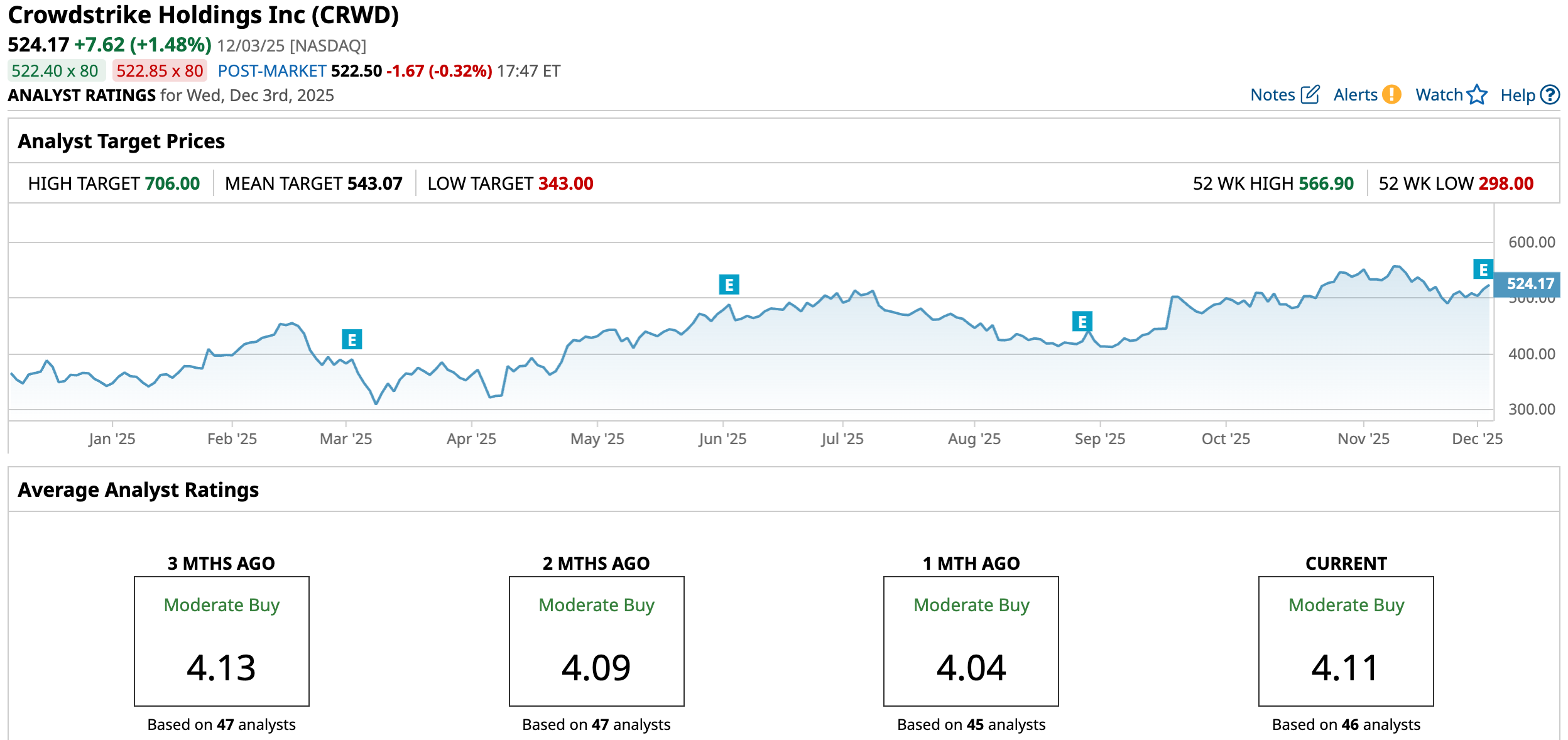 Wedbush Securities analyst Dan Ives had an “Outperform” rating on the stock with a price target of $600, reflecting an upside potential of 14.5% from the market rate. The analyst called CrowdStrike the "gold standard" in cybersecurity, noting it's in the early innings of a multi-year growth story fueled by platform consolidation and the AI revolution market opportunity.
