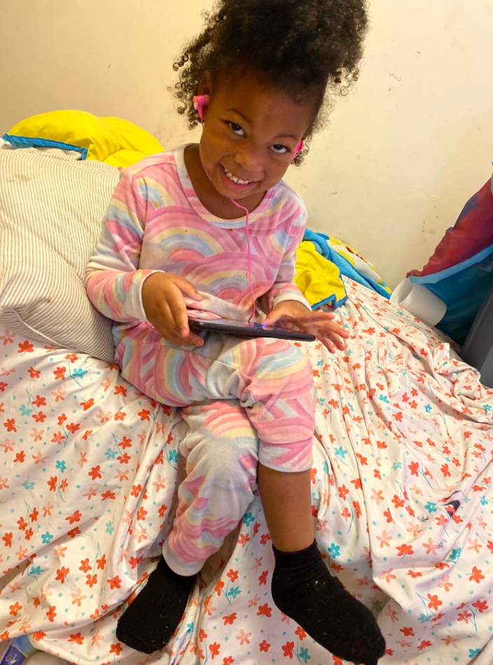 A child enjoys her new tablet on Christmas morning, thanks to a generous donor to The Black Fairy Godmother Foundation. Photo: Courtesy of The Black Fairy Godmother Foundation