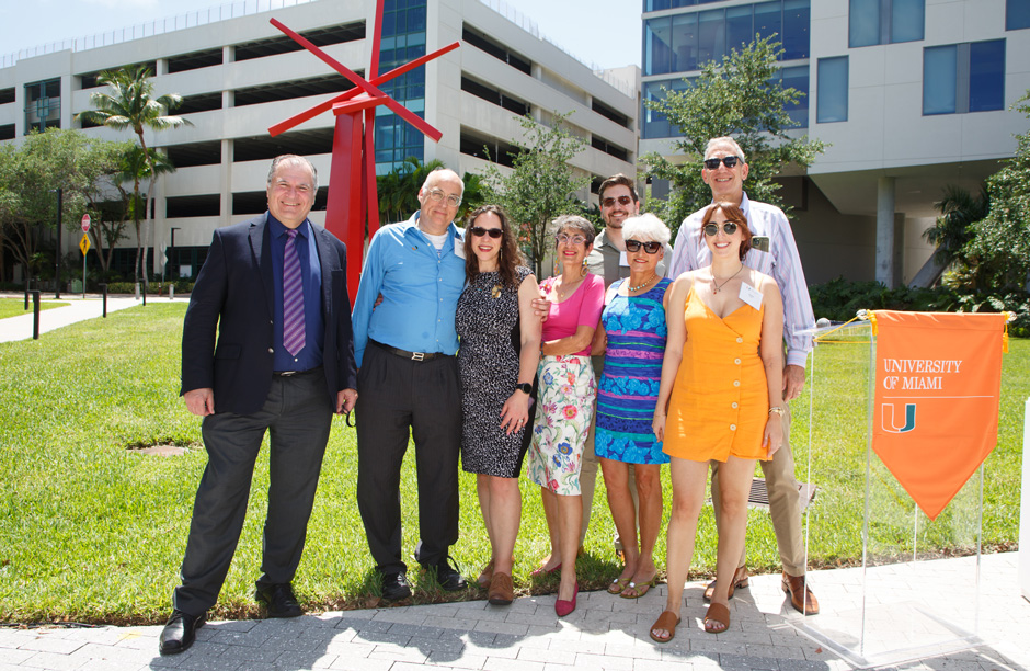 Myrna Palley passed away in 2020, and Sheldon Palley died last year. Their children, Lisa, Donna, and Kevin, continue to honor their parents’ legacy at the University. On April 6, as a prelude to the University’s Centennial Celebration, the Palley Family gathered on the Coral Gables Campus for the official unveiling of a monumental abstract sculpture that is among the most visible manifestations of that legacy.